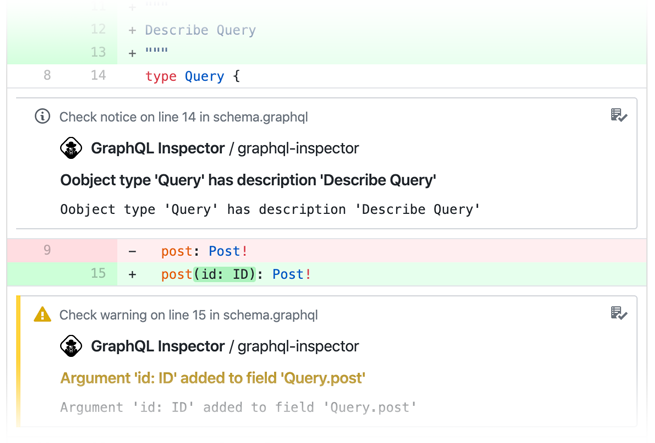 GitHub offers in-code annotations and GraphQL Inspector, both App and Action enables you to use them. Nice and clean way to understand what have really changed and how it looked before and after.